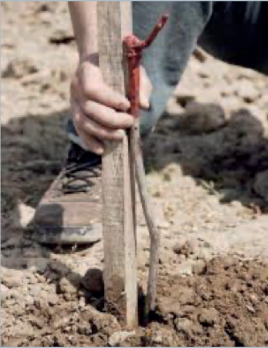 - Au printemps, de préférence avec des plants grefféssoudés hautes tiges (le greffon est placé sur un porte-greffe de 70 cm environ de long). Le plant est directement monté, avec la végétation plus proche du fil porteur et de la zone de pulvérisation des produits phytosanitaires.