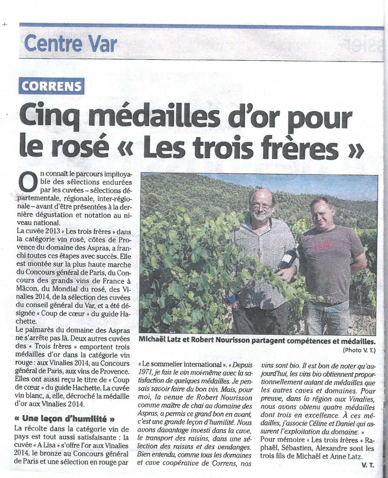 Félicitation au domaine des Aspras pour la cuvée 2013 "Les trois frères" dans la catégorie vin rosé, Côtes de Provence.